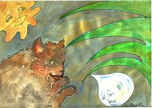 Per passare il tempo, da sotto quel tettuccio di verdi pinnule , Salterella si era messa a osservare cosa succedeva in quel piccolo angolo di mondo; attraversò il greto un gatto dal pelo di colore indefinito, magro e spelacchiato. Dalla bocca gli penzolava una salsiccia, forse rubata a casa di Manfredo il macellaio. L’animale si rincantucciò in uno spiazzo ombroso, proprio accanto alle nostre due amiche, e azzannò ingordamente il boccone: non l’avesse mai fatto! Subito emise un miagolio irritato di protesta: sentiva in bocca uno strano gusto di rancido, che glielo fece sputar via nonostante la fame nera… Ci sarebbe proprio voluto una bella ciotola d’acqua fresca ma, vista la siccità del periodo, si sarebbe accontentato anche solo di rinfrescarsi bocca e baffi con una minuscola goccia d’acqua… ma il fiume era completamente asciutto.