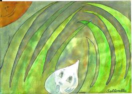 Giaceva stremata, sul fondale in secca di un corso d’acqua montano, una minuscola goccia d’acqua di rara trasparenza. Da qualche giorno era rimasta sola; le sue compagne, sfinite per la mancanza di pioggia, si erano addormentate sul greto del fiume, sciogliendosi a una a una sotto il torrido abbraccio del sole. Anche la piccola goccia pareva ormai non avere speranza; attendeva, rassegnata alla fine, che l’astro di fuoco toccasse lo zenit quando, dal limitare del profumato bosco di mirtilli a lei antistante, le era parso di udire un bisbigliare accorato: “Piccola, piccola mia, su, da brava, rotola dolcemente su te stessa e giungi fin qui, sotto le mie foglie. Ti proteggerò io dai raggi di Mastro Sole, almeno fino a che non si scioglieranno le nevi delle grandi Dolomiti o soffieranno in cielo le nubi del nord: vedrai, si rovesceranno allora secchi e secchi d’acqua sulla valle e tu ritroverai altre gocce sorelle”. Salterella, così l’aveva chiamata Nonno Acquazzone, considerando la sua destrezza nel saltellare allegramente da un argine all’altro del fiume, sollevò gli occhietti stanchi e scorse, a breve distanza, una graziosa pianta di felce che, intenerita dalla sua fresca giovinezza, l’attendeva per accartocciarsi pietosamente su di lei, evitandone la fine. Rotolando piano, spingendosi avanti a fatica, graffiando la sua purezza contro le pietre più aguzze, Salterella arrivò infine alla felce rigogliosa che, velocemente, l’avvolse con le sue fronde. Subito chiuse gli occhi, convinta che quella dolce frescura non fosse altro che il respiro della Morte che avanzava, ma presto si addormentò e la generosa pianta, con un fruscio delicato e acquietante, la cullò dolcemente sino al mattino successivo. Nacque da quel momento un prezioso legame tra la felce e la goccia, tanto che Salterella non rimpiangeva più come un tempo le perdute sorelle, ma aspettava paziente il nuovo avvento delle piogge, ascoltando attenta storie e leggende che l’amica, con affettuosa pazienza e un sentimento di materna protezione, le raccontava.