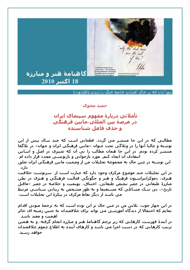 ‫از اﯾﻦ ﻧﮑﺎﺗﯽ ﮐﻪ ﺑﺮ ﺷﻤﺮدﯾﻢ ﺑﻪ زودی ﺟﮫﺖ درک ﻣﻔﮫﻮم ﺳﯿﻨﻤﺎی اﯾﺮان در ﻣﺤﺎﻓﻞ‬‫ﻣﺎﺑﯿﻦ ﻓﺮھﻨﮕﯽ ﺑﻪ ﻧﺘﺎﯾﺞ ﺑﺴﯿﺎر ﺟﺎﻟﺒﯽ ﺧﻮاھﯿﻢ رﺳﯿﺪ. ﭼﻨﯿﻦ ﻧﺘﯿﺠﻪ ای در ﺗﻌﻠﻖ ﺗﻤﺎم و‬‫ﺗﻘﺮﯾﺒﺎ ﺗﻤﺎم ﻣﺤﺼﻮﻻت و ﻓﻌﺎﻟﯿﺖ ھﺎی ﻣﺎﺑﯿﻦ ﻓﺮھﻨﮕﯽ در ارﺗﺒﺎط ﺑﺎ اﯾﺮان و ﺟﮫﺎن اﺳﺖ‬‫)ﯾﻌﻨﯽ اﯾﻦ ﮐﻪ ﻣﺤﺼﻮﻻت ﻓﺮھﻨﮕﯽ و ﻣﺎﺑﯿﻦ ﻓﺮھﻨﮕﯽ اﭘﻮزﯾﺴﯿﻮن ھﺎی اﯾﺮاﻧﯽ ﻧﯿﺰ در‬‫ھﻤﯿﻦ راﺑﻄﻪ ﻗﺎﺑﻞ ﺑﺮرﺳﯽ ﻣﯽ ﺑﺎﺷﺪ( .‬