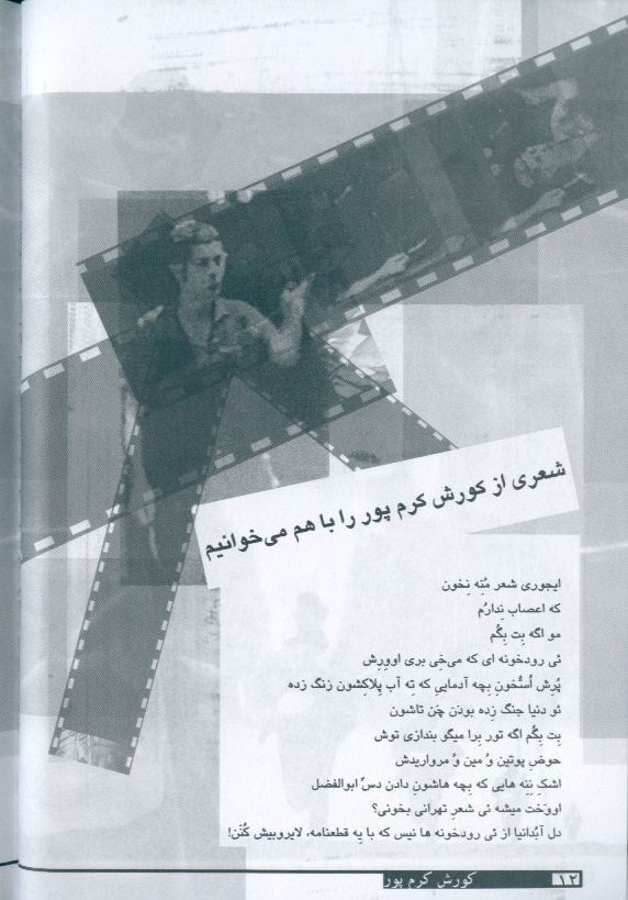 در شعر ( شعري از كورش كرم پور را با هم مي خوانيم ) تصوير بهروز وثوقي را شاهد هستيم كه از شب شعري بيرون آمده Ùˆ دست خود را به اعتراض بالا آورده Ùˆ ØØ§Ù„ اگر برگرديم به سطر اول شعر ( ايجوري شعر مونو نخون كه اعصاب ندارم ) Ùˆ باز رجوع كنيم به نگاتيو مشاهده Ú©Ù† کنیم Ú©Ù‡ ( کارکرد Ùˆ ] منش[ کورش کرم پور اثری مستقل از ( Ùیلمهای کیمیایی ) در خود برض Ù…ÛŒ دهد . اين ( collage )1 باعث مي شود ما در ØÙŠÙ† خواندن اثر با يك نمايش Ùيلم نيز رو به رو شويم Ø› Ùيلمي كه كارگردانش كورش كرم پور است .